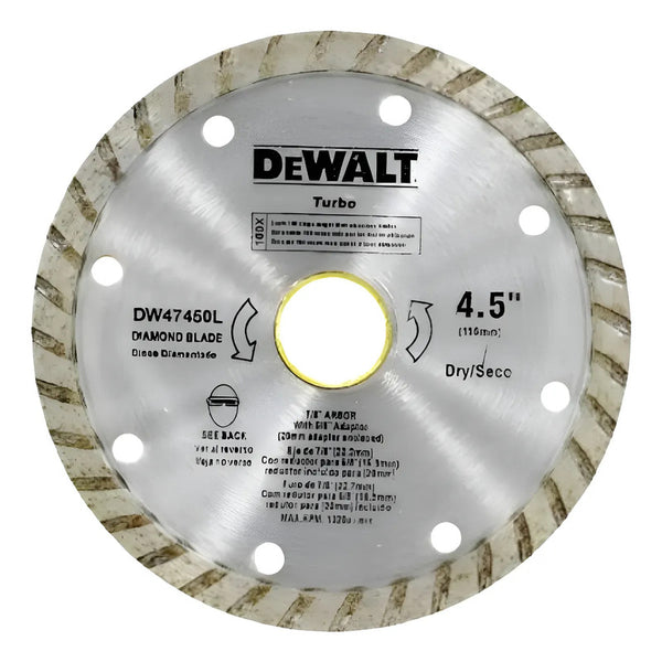 Bienvenid@ a RENO - REFACCIONES EXPRESS DEL NORTE Disco Diamantado de 4 1/2" plateado de la marca DEWALT modelo DW47450L. - Para velocidad media. - Uso: azulejo, concreto, mármol y granito. - Con REDUCTOR DE:...