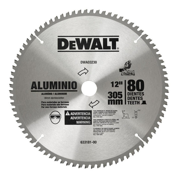 Disco de 12 pulgadas para Aluminio modelo DWA03230 marca Dewalt. Características - Medida: 12 Pulg (305 mm) - Uso: Aluminio - Para materiales no ferrosos - 80 Dientes de carburo de tungsteno Especificaciones ¡Disponible en...