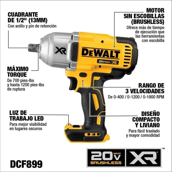 Bienvenid@ a RENO - REFACCIONES EXPRESS DEL NORTE Llave de Impacto de ½ pulgada (13mm) XR Alto Torque de 20v Max de la marca DeWalt modelo DCF899B. - Cuadrante 1/2" (13mm). - Velocidad sin Carga...