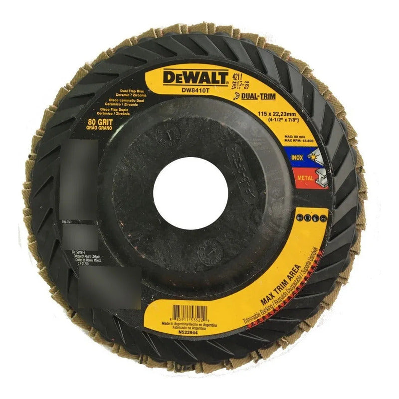 Disco doble borde 4 1/2x7/8 granos 80 solapas de la marca DEWALT modelo DW8410T.